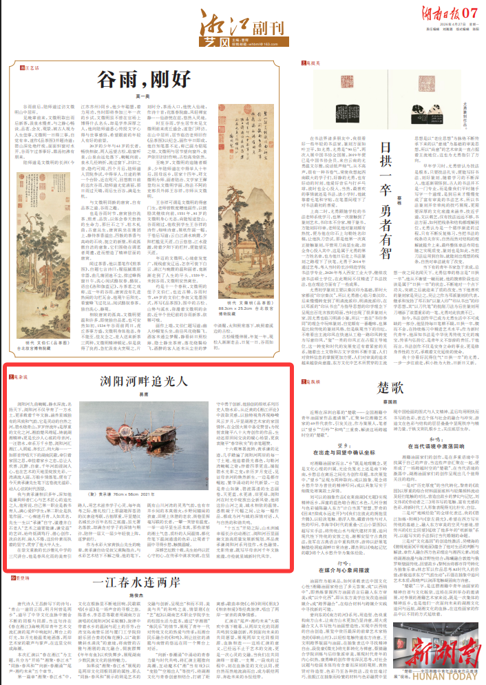 浏阳河九曲蜿蜒,静水深流,名扬天下。浏阳河不仅孕育了一方水土,更承载着千年文脉,涵养星城独有的风致和气韵。它是灵动的自然之河,碧水绕青山,岁岁伴流年;是厚重的文化之河,湘韵楚风绵延,铸就湖湘精神;更是长沙人心底的母亲河,一汪碧水,牵系万千乡愁。浏阳河汇湘江、入洞庭、奔长江、向大海……一如那首传唱天下的湖南民歌,牵引着家国之思,牵挂着家乡之恋,总让人欢喜、沉醉、自豪。千年河韵浸润人心,也在艺术的天地里绽放光彩。一湾清流入画,万般乡情落笔,便有了今天黄承谦先生笔下这卷流光溢彩、动人心弦的时代图景。