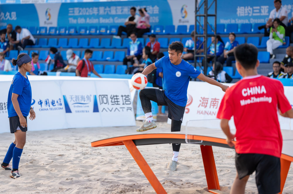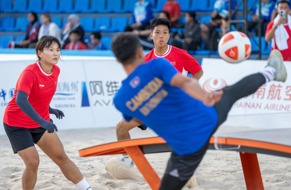 4月26日,在海南三亚举行的第六届亚洲沙滩运动会台克球混合双打小组赛中,中国组合龚芙蕾/茆哲铭2比0战胜柬埔寨组合本通维里亚克/迪肯延。