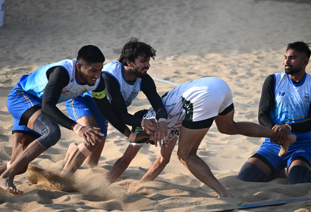 4月26日,印度队选手布里金德拉·辛格·乔杜里(左一)在比赛中。当日,在海南三亚举行的第六届亚洲沙滩运动会沙滩卡巴迪男子半决赛中,印度队50:28战胜巴基斯坦队,晋级决赛。新华社记者 赵子硕 摄