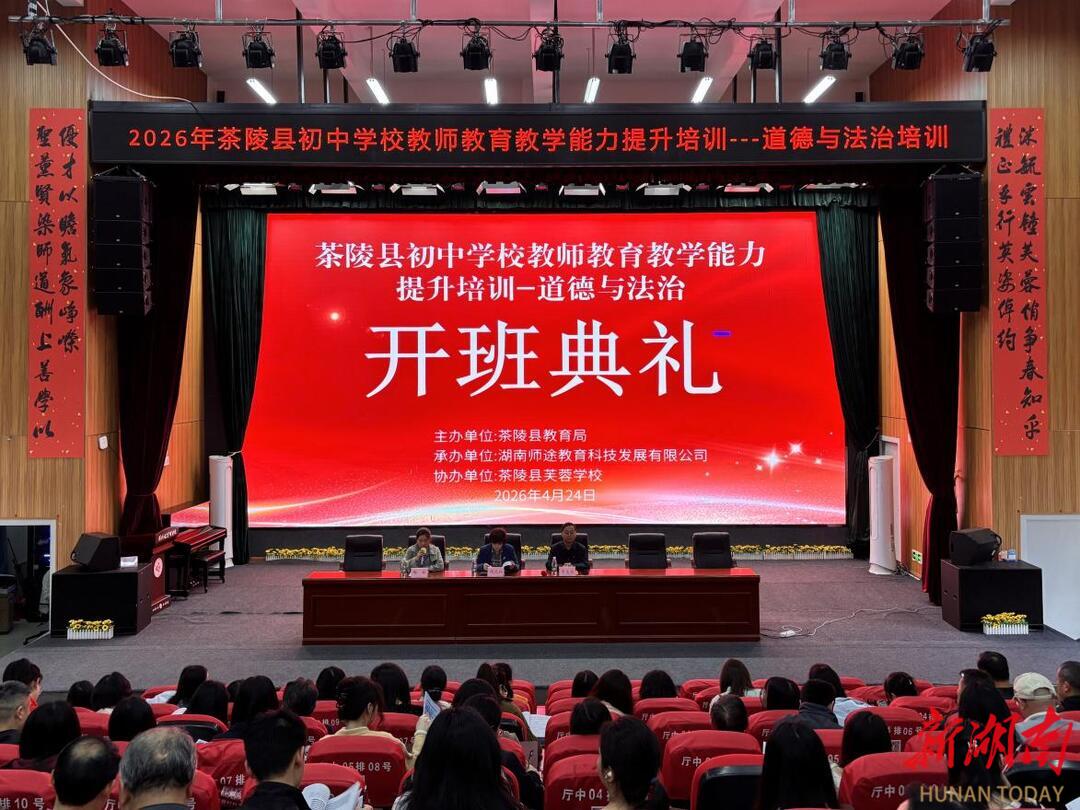 新湖南客户端4月27日讯(通讯员 陶林)春风润教坛,研修正当时。4月24日,2026年茶陵县初中学校教师教育教学能力提升培训——道德与法治项目研修班在茶陵县芙蓉学校报告厅正式开班。全县110名初中道德与法治教师齐聚一堂,开启为期5天、分两阶段实施的集中研修,通过专家引领、案例剖析、实操演练、互动研讨等多元形式,共探思政课教学新路径,全力推动茶陵县初中道德与法治教育高质量发展。