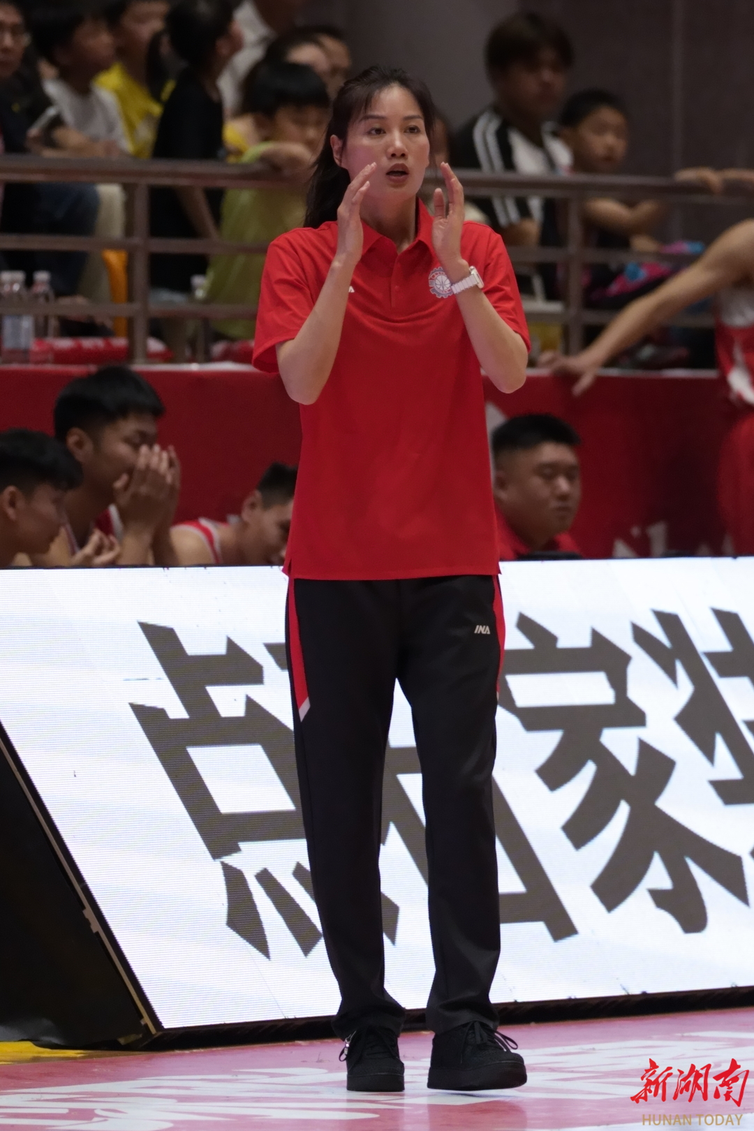 4月26日晚,湘潭队主场以73:54获胜,拿下球队六连胜!(湘潭队身着红色战袍,图为湘潭队教练赵伟丽在比赛中。摄影/董晓辰)