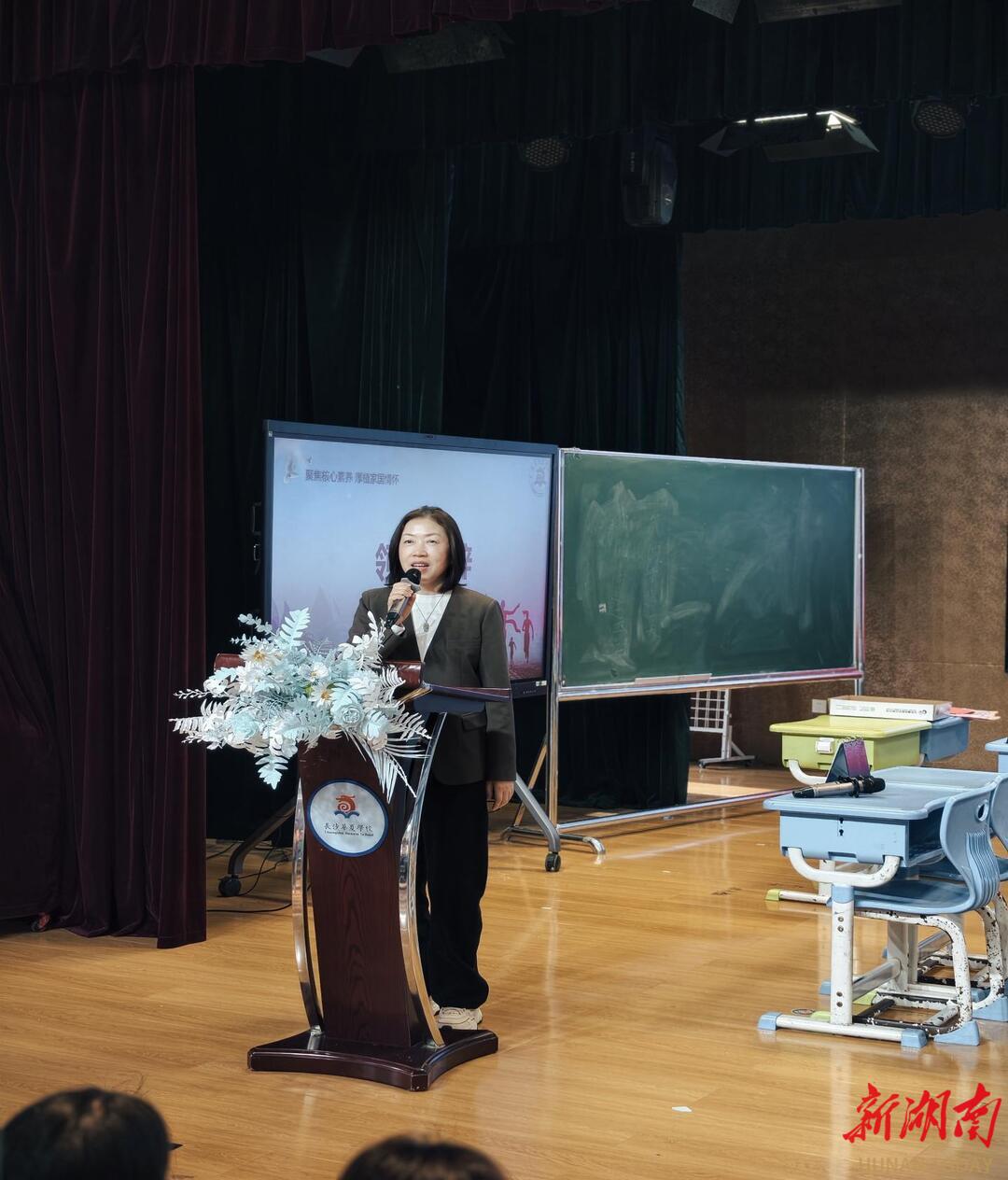长沙县圣和集团总校长、长沙市泉塘第二小学党总支书记李霖滋讲话,李书记聚焦青少年价值观塑造,强调应从学生真实生活出发,通过历史与现实教育、校内外协同实,引导学生厘清自我认知,将个体情感升华为家国担当,夯实思想根基。