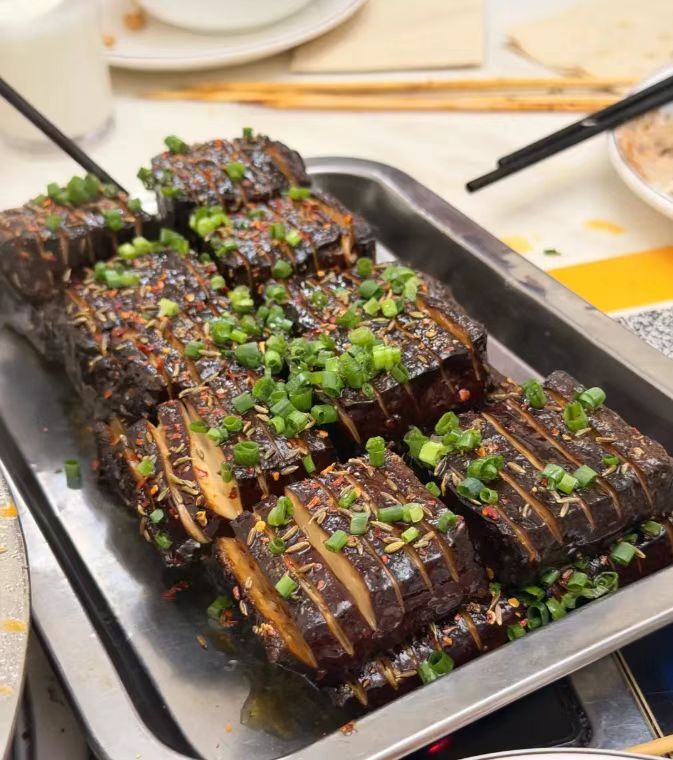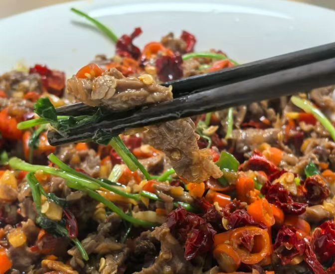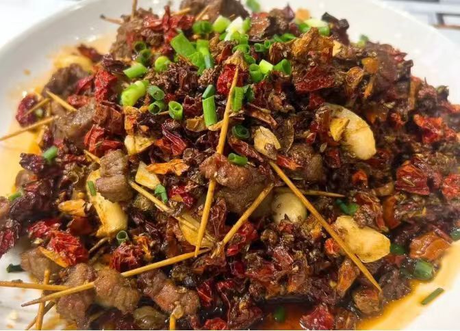 店里的牙签牛肉,是不少人专程打卡的理由。牛肉切得均匀,过油后加孜然、干辣椒大火爆炒,芝麻与辣椒的香气完全融入肉里,裹着满满的锅气,香而带点微辣,口感十分出众。