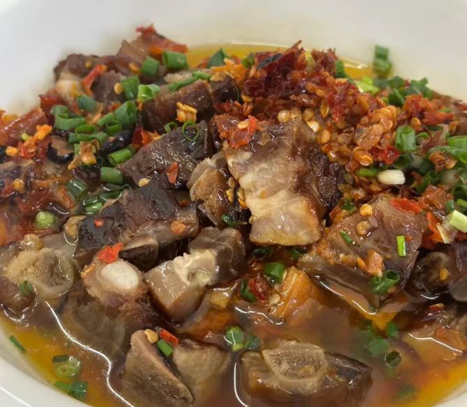 还有湖南人无法拒绝的蒸腊排骨,选用仔排制作,烟熏风味浓郁,料汁调得恰到好处,咸香不齁,垫底的香干也吸饱了汤汁,带来不小的惊喜。