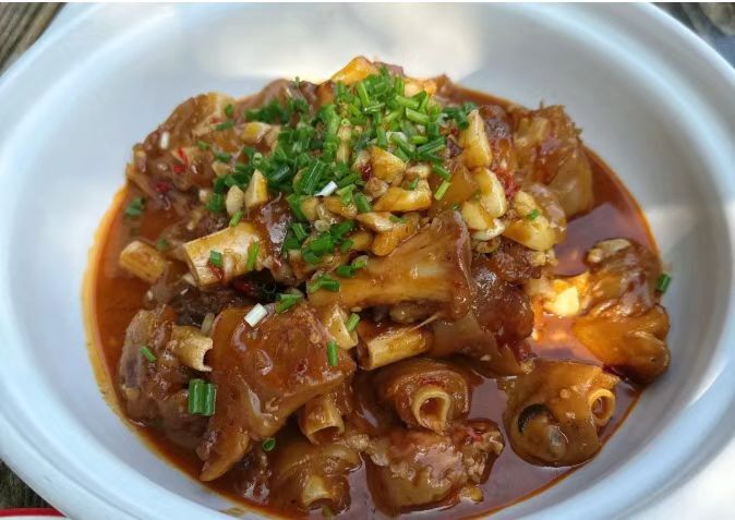 镇店的砂锅羊蹄是老客到店的必点,新鲜羊蹄处理得干净无膻,放进砂锅文火慢煨两个钟头,炖到皮肉酥烂脱骨,用筷子轻轻一挑就能分离,裹着老板的秘制酱汁,每一口都满是胶质。