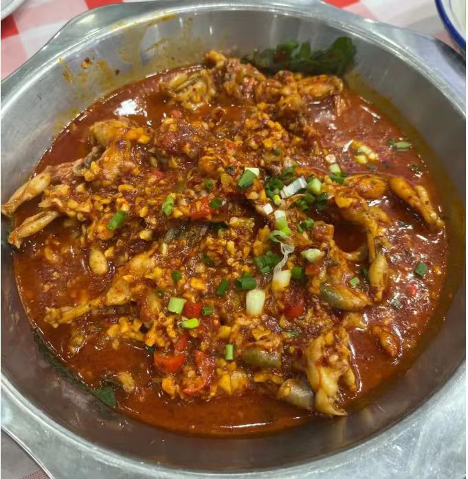 还有老长沙做法的水煮田鸡,新鲜田鸡加大量蒜蓉、辣椒煨煮,肉质Q弹,蒜辣香浓,加一份清水面拌进汤汁里,口感格外惊艳。不管是下班小聚,还是夜宵约酒,这里都很合适。