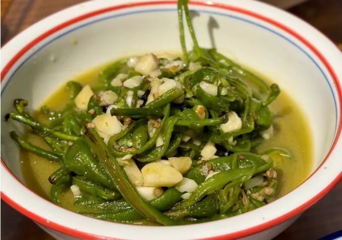 还有还原老长沙家常味的水煮辣椒,新鲜线椒和青椒整根下锅,加豆豉、蒜末慢煮,吸饱汤汁的辣椒软嫩却不烂,鲜辣入味,解腻又开胃。