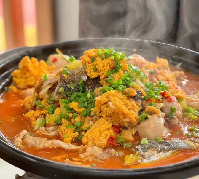 桌桌必点的鱼籽鱼泡火锅,是店里的王牌,鱼籽饱满、鱼泡个大,用经典的老长沙做法烹制,汤底鲜醇,带着淡淡的酸辣味,紫苏与灯笼椒的风味融合得恰到好处,热乎的一锅,不管什么季节吃都很熨帖。