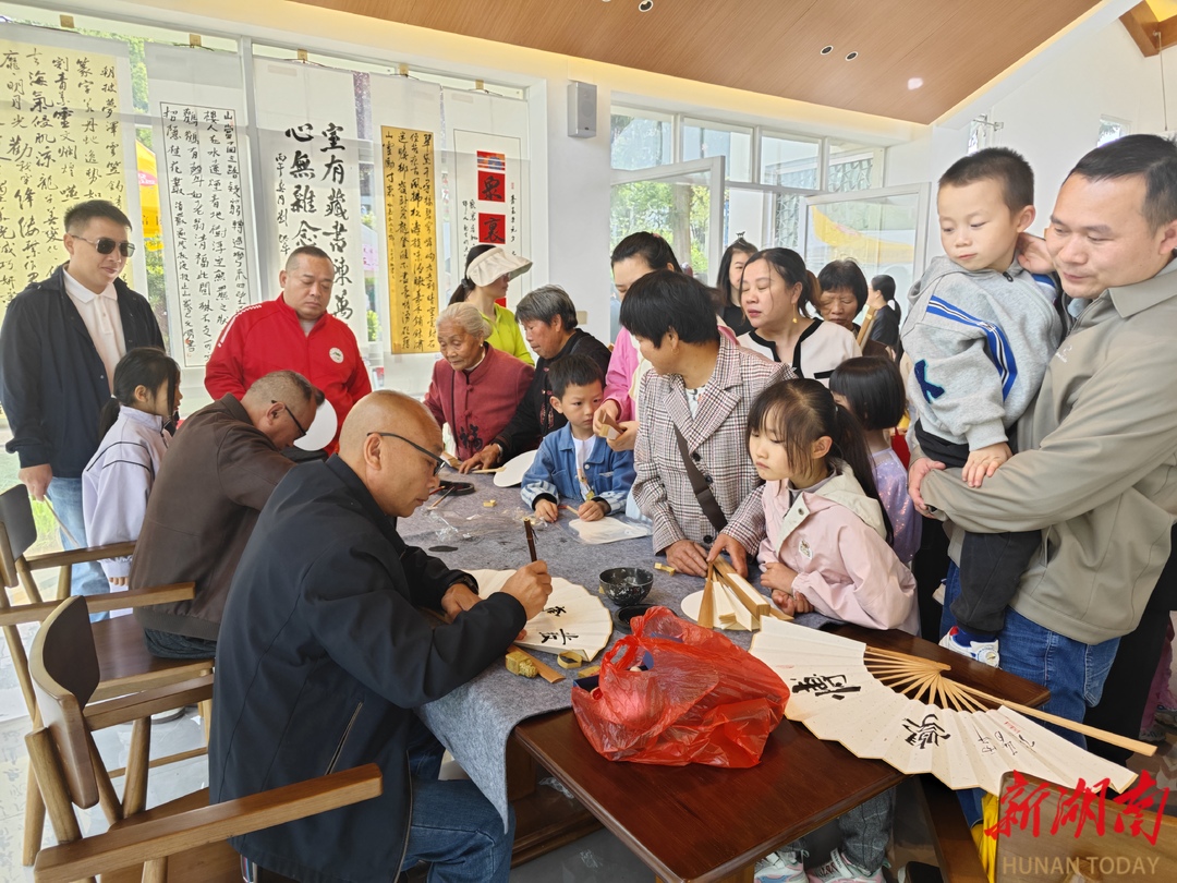 最受群众欢迎的当属现场创作环节。县文联的书画骨干们铺纸研墨、挥毫泼墨,在一方方精美扇面上即兴创作,时而凝神构思,时而落笔如风,笔墨流转间,山水、花鸟、书法等佳作接连成型。围观的群众兴致勃勃,有的踮足观望,有的轻声称赞,不少人还主动上前请教笔法技巧,现场氛围热烈而融洽。一幅幅带着墨香的扇面作品,被免费送到群众手中,让大家在观棋、赏景之余,既能近距离感受传统书画的魅力,又能收获一份独特的文化祝福。