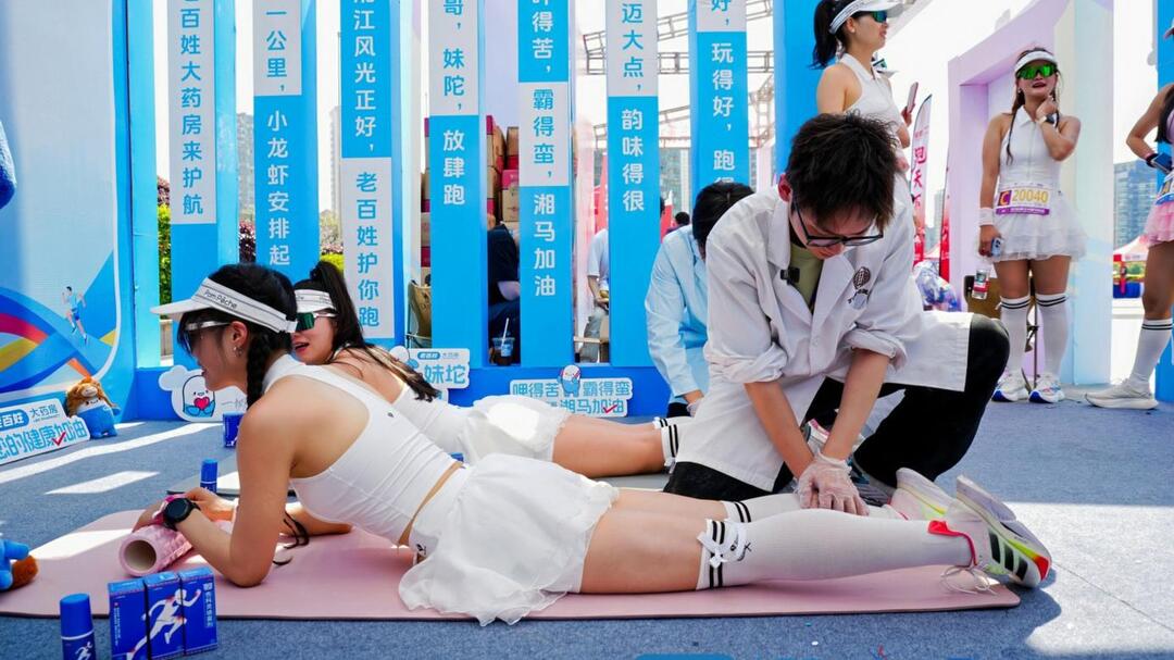 赛事主会场内,活动展区人气高涨。本次老百姓大药房携手中美华东伤科灵,打造湘马跑者爱心驿站,特设专业赛后康复服务区:免费开放专业筋膜放松按摩服务,筋膜枪、泡沫轴、瑜伽垫等全套运动放松器械无偿供跑者使用,搭配专业理疗师现场开展跑后拉伸科普指导,全方位缓解赛后肌肉酸痛,帮助跑者科学快速恢复身体状态,真正实现 “跑完无负担,赛后轻松恢复”。