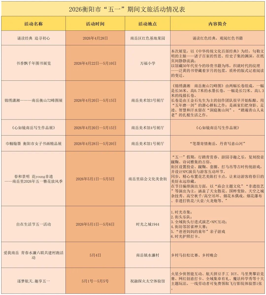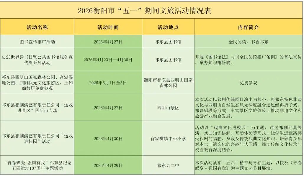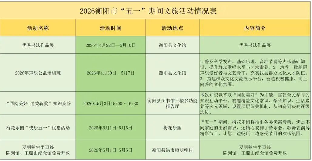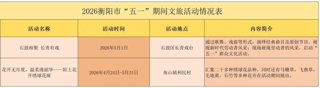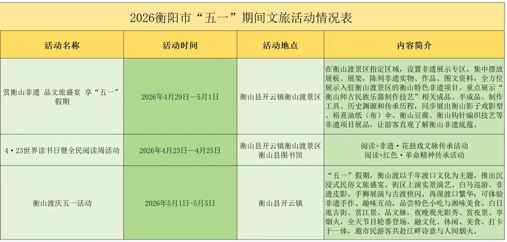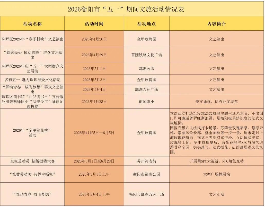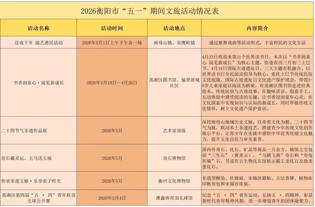 五一假期去哪玩?不如来衡阳,感受一场“文化+潮玩+亲子+非遗”的全方位盛宴!从非遗体验到亲子互动,从经典戏曲到时尚机车秀衡阳各县市区,超100场“五一”活动轮番登场,跟着这份攻略,玩转雁城嗨翻整个假期!