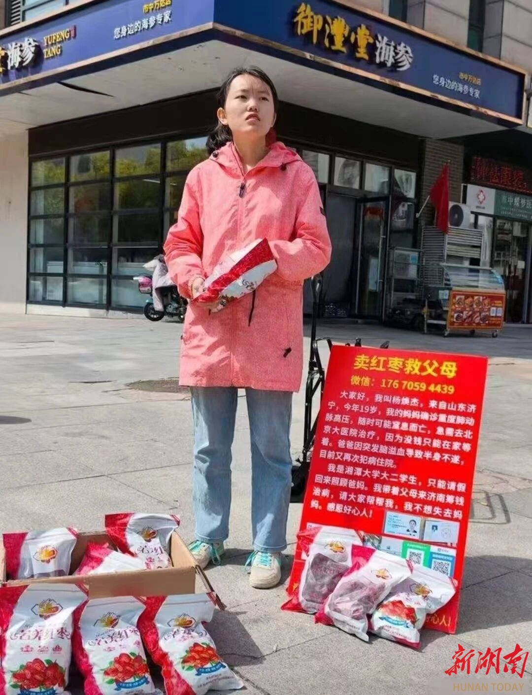 女孩名叫杨焕杰,老家在山东济宁,是湖南湘潭大学的大二学生。19岁的她,不在大学校园里,却在济南的街头摆摊卖红枣,只为给母亲赚钱治病。