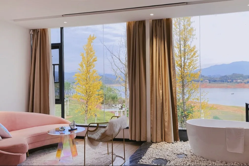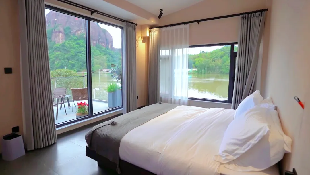 有趣之处:北欧极简轻奢风格与湖光山色相映成趣。临湖客房可躺看晨雾,轻松解锁湖居惬意时光。