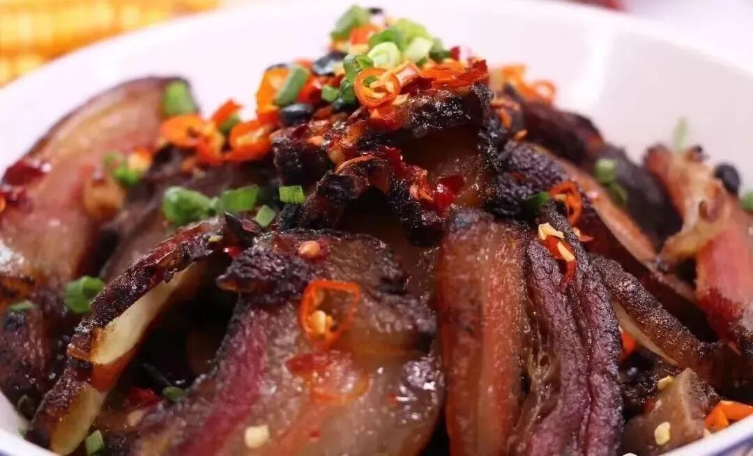 五盖山平均海拔 800 米以上,昼夜温差大,气候独特,盛产优质土猪肉。 腊肉选用农家自养、吃野菜长大、喂养超一年的土猪肉,经传统工艺腌制、熏制而成,肉质紧实,腊香浓郁。简单清蒸后,油脂晶莹,咸香不腻,肥瘦相间恰到好处,是郴州知名名优特产之一,也是本地人餐桌上的下饭神器。