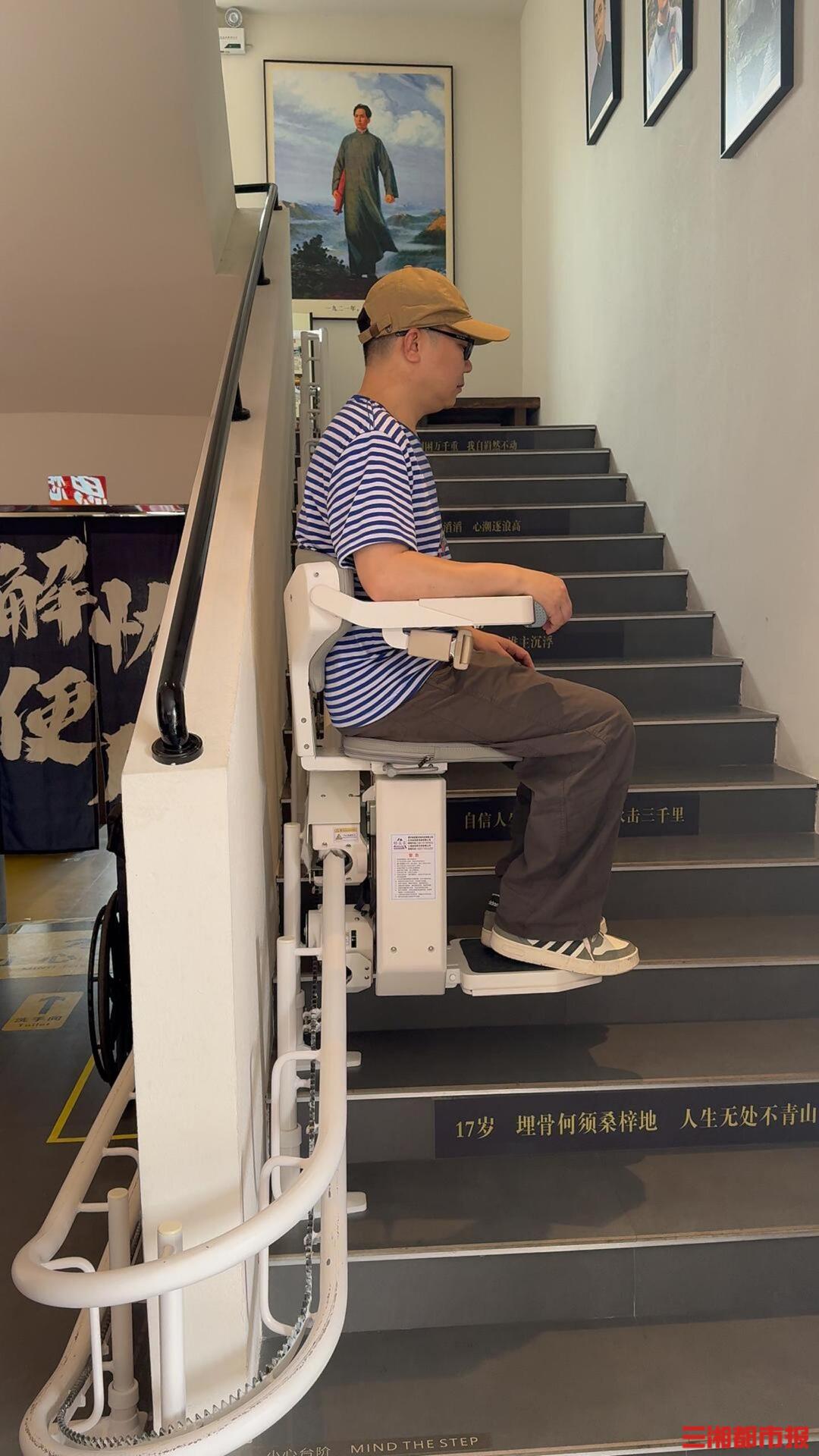 韶山会客厅负责人毛伟介绍,“我们邀请残友实地体验,听取反馈再调整,追求实用。比如老房子加装电梯不现实,我们就配上爬楼机,由受过培训的服务员操作,既安全又平稳。出入口的台阶改成缓坡,加装扶手,地面做防滑处理——让残友从下车那一刻起,就不再需要求助他人。”