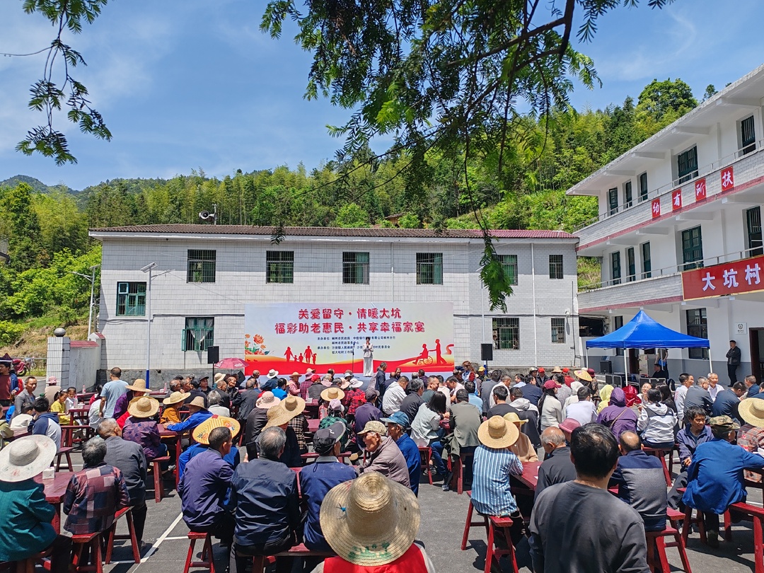 在大坑村新时代文明实践站所前,微风和煦,村里留守老人、儿童欢聚一堂,举行“关爱留守・情暖大坑——共享幸福家宴”暨长者食堂试营业活动。