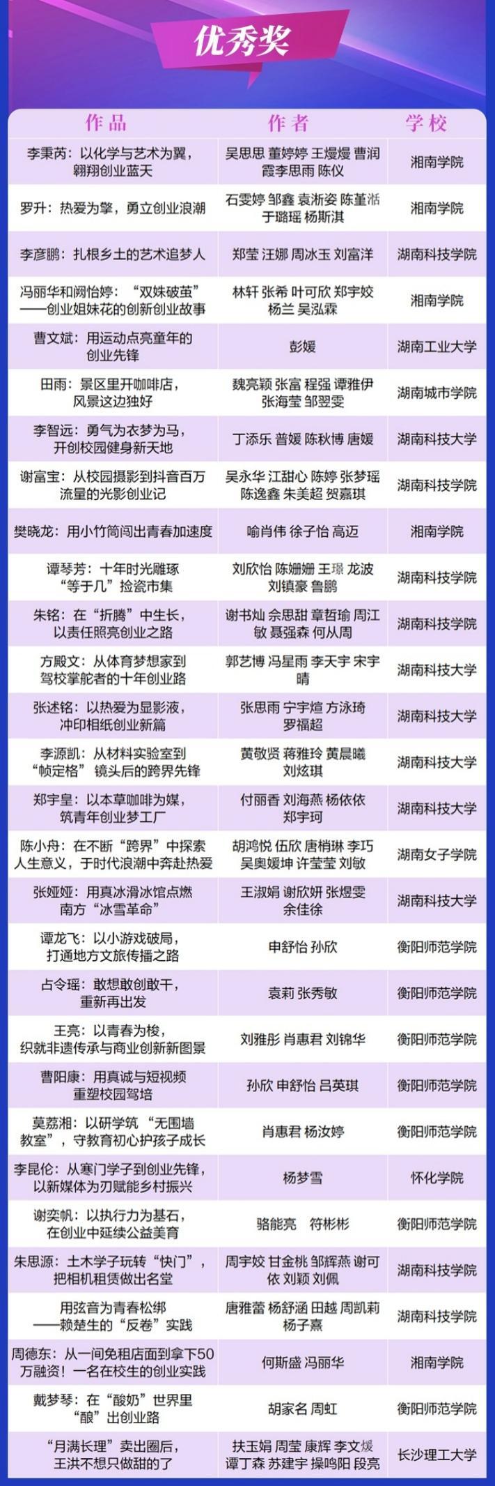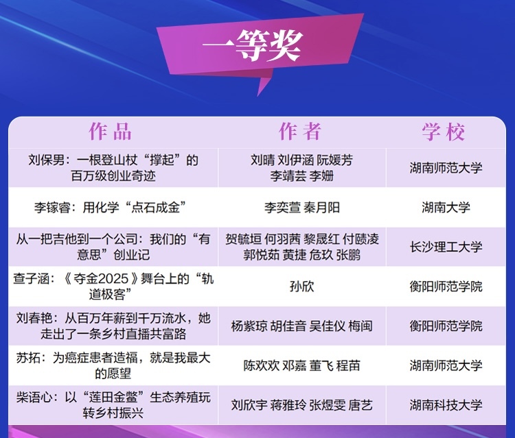 本次活动中,衡阳师范学院新闻与传播学院获得一等奖2项、二等奖1项、三等奖4项及优秀奖7项。其中一等奖作品《查子涵:<夺金2025>舞台上的“轨道极客”》《刘春艳:从百万年薪到千山万水,她走出了一条乡村直播共富路》凭借独特的青年视角和扎实的采编能力获得评审组高度评价。这一成绩在参与高校中尤为突出,不仅是我院“以赛促学 项目驱动”教学模式的直接检验,更是展现了地方院校在融媒体实践教学中的扎实功底。