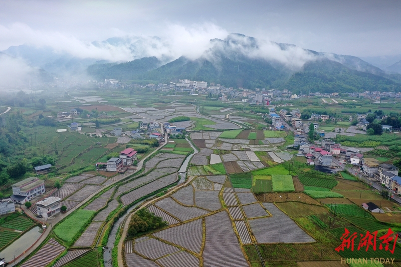 4月27日,龙山县茨岩塘镇云雾缭绕,民居错落有致,田野色彩斑斓,高速和国道穿镇而过。这片红色热土,如今依托烤烟、蔬菜、百合等特色产业,驱动乡村振兴,新农村建设成效显著,呈现出一幅产业兴旺、安居乐业的美丽乡村画卷。曾祥辉 摄(湖南图片库)