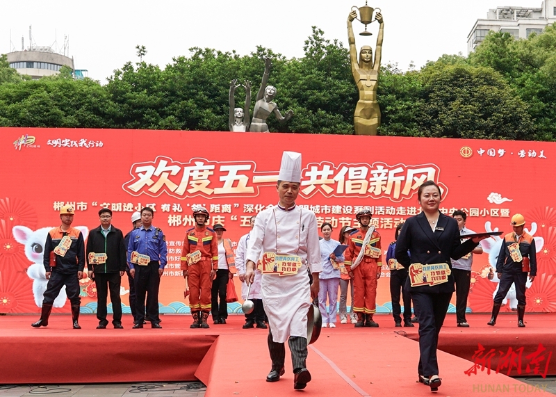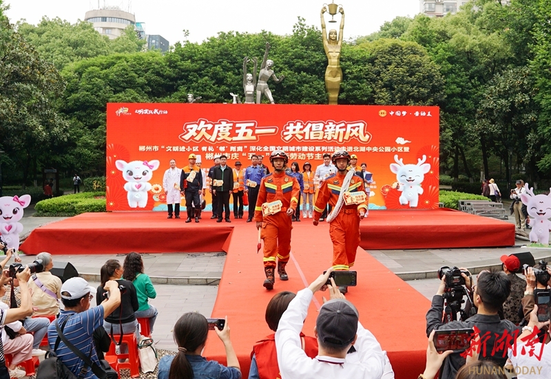 4月27日,郴州市“文明进小区 有礼‘邻’距离”系列活动暨庆“五一”主题活动在北湖公园举行。来自建筑、环卫、餐饮、快递等行业的普通劳动者登上T台,自信昂扬地展示着行业风采,弘扬劳动光荣的时代精神。李加诺 摄(湖南图片库)
