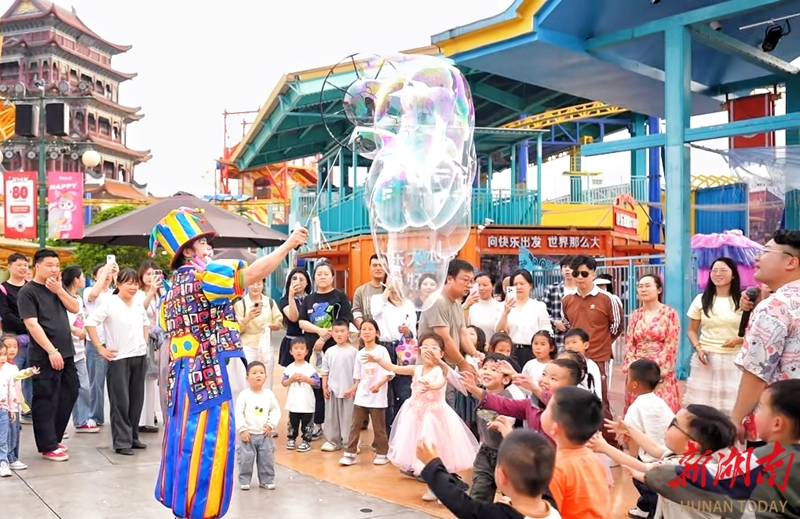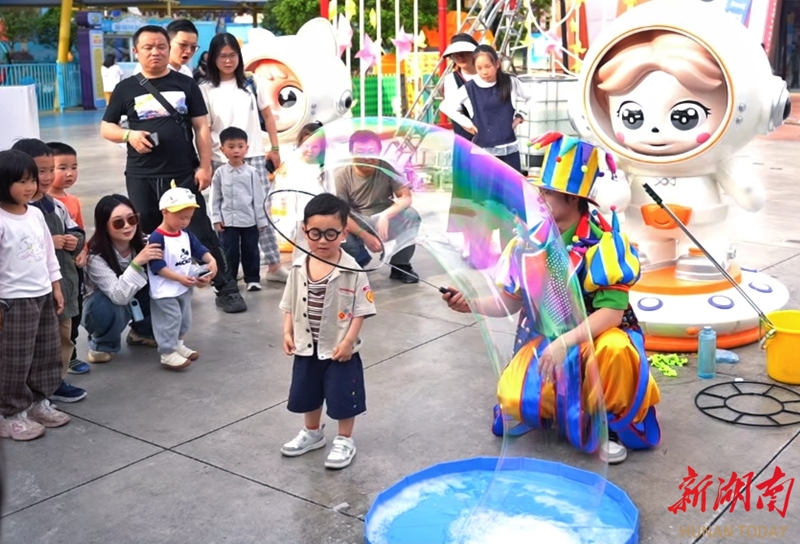 4月27日,游客在湘潭万楼·芒果青年码头参加狂欢节系列活动。“五一”假期临近,该景区启动“码头狂欢节”,喷彩大战、机车巡游、沉浸式光影秀、小丑嘉年华、特技团队飞车表演等节目精彩纷呈,打造“人人是主角”的狂欢氛围。湖南日报全媒体记者 徐行 通讯员 陈煜戈 摄影报道
