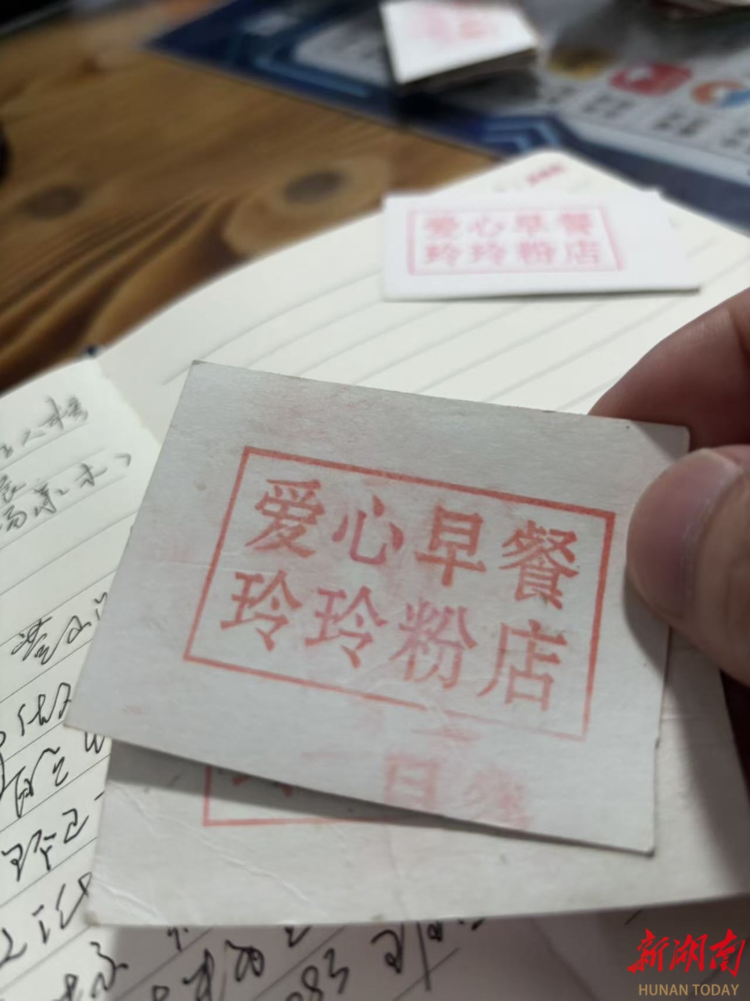 吃完结账,环卫工人递给刘智玲一张烟盒纸片,上面盖印“爱心早餐,玲玲粉店”8个字。刘智玲笑吟吟接过纸片说:“辛苦了,明天再来。”