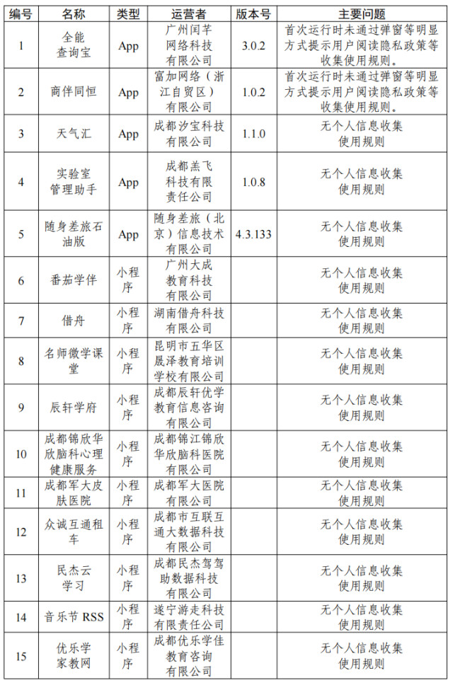 一、全能查询宝、商伴同恒等15款App无个人信息收集使用规则或在首次运行时未通过弹窗等明显方式提示用户阅读个人信息收集使用规则(详见下表)。