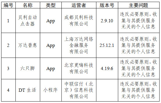 根据中央网信办、工业和信息化部、公安部联合发布的《关于开展2026年个人信息保护系列专项行动的公告》,依据《网络安全法》《个人信息保护法》《网络数据安全管理条例》《App违法违规收集使用个人信息行为认定方法》等法律法规和有关规定,中央网信办组织对App(含小程序)收集使用个人信息行为进行检测,现对有关问题予以通报: