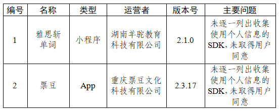 二、雅思斩单词、票豆等2款App未逐一列出收集使用个人信息的SDK,未取得用户同意(详见下表)。