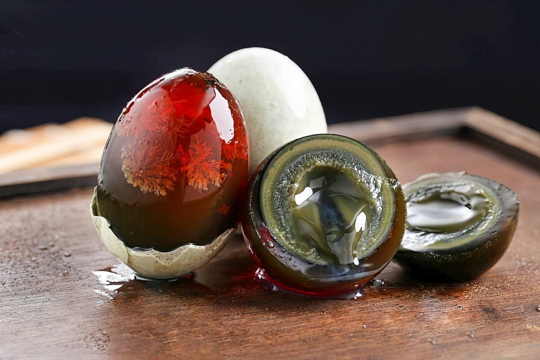 我迫不及待地帮祖母揭开坛口,刹那间,一股独特醇厚的气息扑鼻而来。祖母取出一枚皮蛋,外层裹着的黄泥早已风干板结,质地粗粝。轻轻敲落干硬泥壳,再细细剥去覆着青灰斑驳纹路的蛋壳,乌润如墨的蛋白便露了出来,泛着淡淡的柔光,内里缀满细密的松花,恰似冬日凝于玻璃窗上的薄霜。蛋黄沉凝成黛青之色,宛如膏脂,轻轻掰开,中心还藏着一汪软糯柔润的溏心。经过草木灰的浸润、时光的慢酿,一枚枚鸭蛋,就此脱胎换骨,悄然蜕变。祖母总说,这样的品相,才是皮蛋最好的模样。尝一口,咸、香、滑、嫩瞬间在舌尖上化开,那滋味,简直妙不可言。