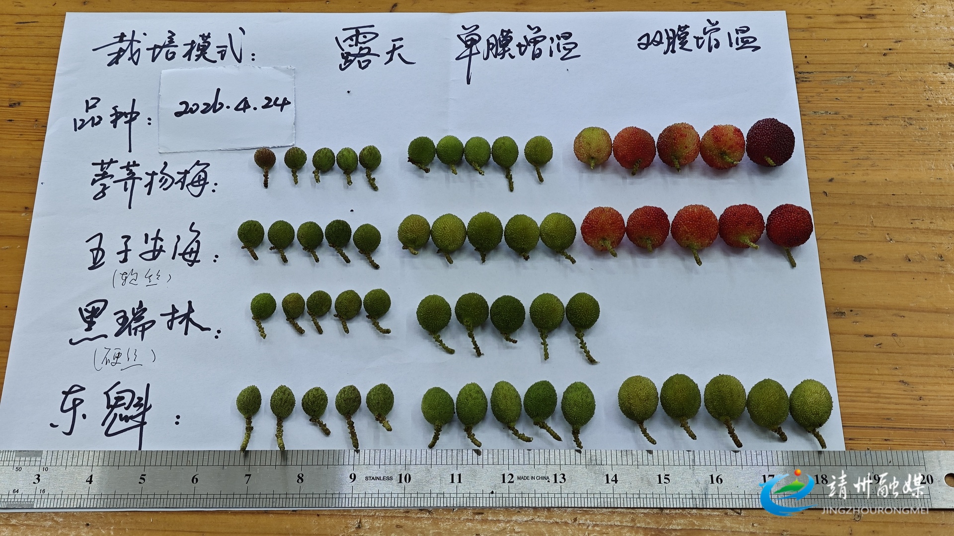 ▲双膜、单膜、露天三种栽种模式下杨梅生长情况对比(蒲湘萍 摄)