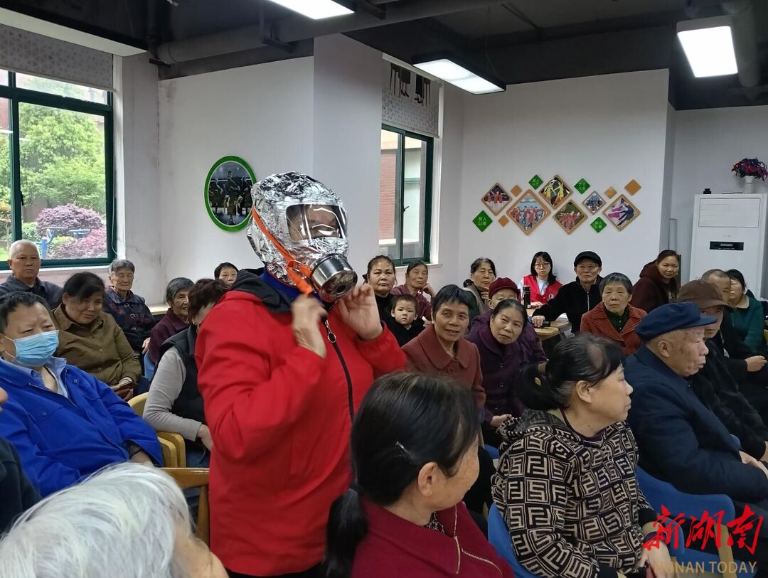 在望府路社区,宣讲员现场演示过滤式消防自救呼吸器的使用方法