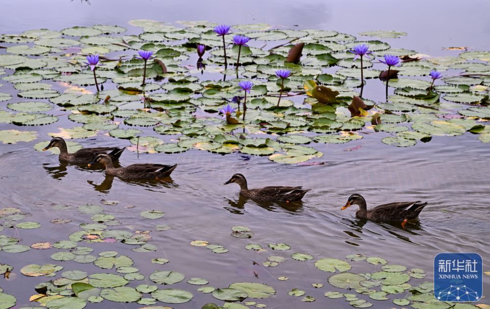 ↑ 4月27日在广西南宁市南湖公园拍摄的睡莲。新华社发(苗育才摄)