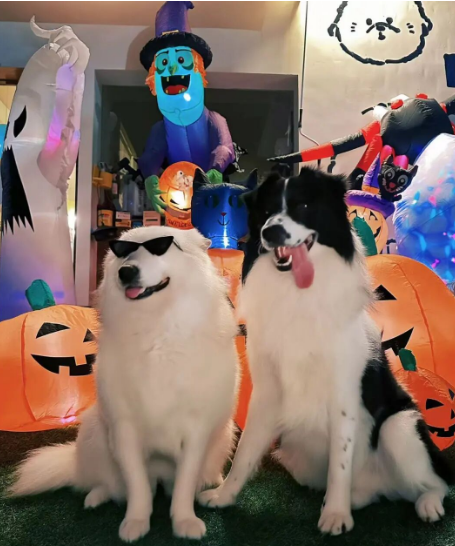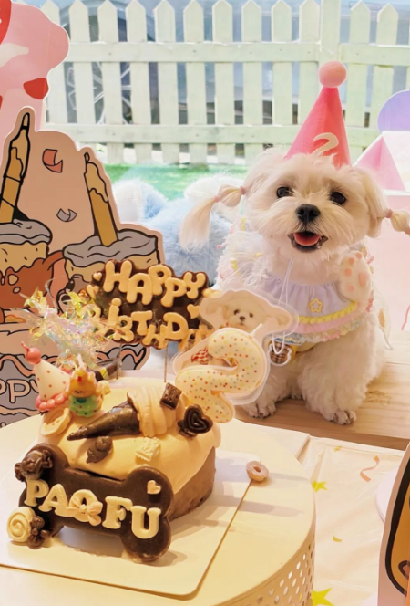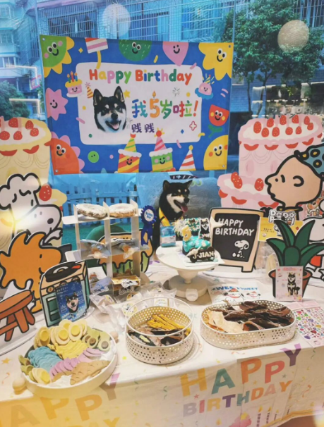 下午三点,院子里的光线正好。一张桌子被临时腾出来,铺上布,气球和小灯简单挂起。一只名叫贱贱的5岁小狗被牵在中间,旁边坐着的是它的狗朋友们,大家兴奋又热情。
