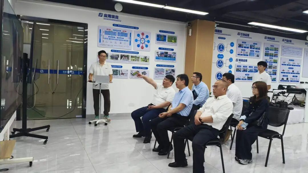 随后,考察团移步至数字演示厅,精飞集团数字部通过大屏幕系统演示了精飞集团多款核心“北斗+无人机数字平台”:其中湖南省北斗+无人机数字农业综合服务平台实现农作物生长监管、统防统治全流程智能化管理;北斗+无人机AI智能巡检平台通过AI算法自动识别电力、交通等基础设施隐患,提升巡检效率;数字孪生中心则以虚拟仿真技术模拟复杂环境作业,为行业培养复合型技术人才。