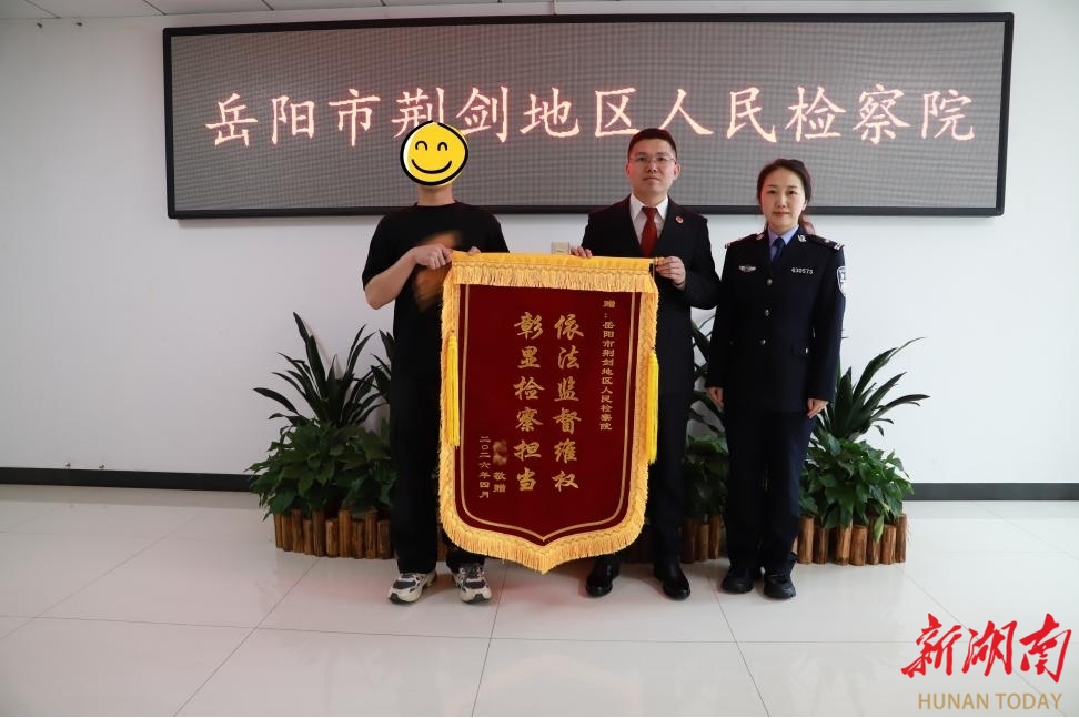 湖南法治报·新湖南客户端讯(通讯员 周铭)4月27日,岳阳市荆剑地区检察院派驻岳阳市看守所检察室收到了一份特殊的礼物——一面当事人送来的锦旗,这不仅是对检察人员履职尽责的高度肯定,更是该院践行司法为民理念、维护司法公正、保障在押人员合法权益的生动缩影。