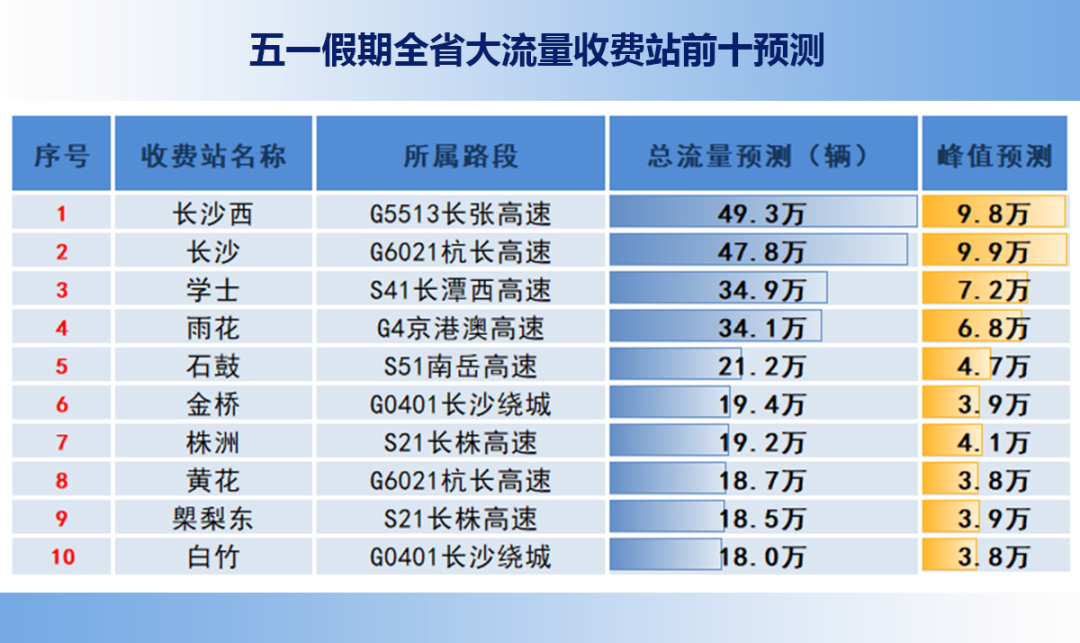根据历年五一假期高速路网流量走势及综合管理平台大数据分析,出行流量主要集中在以长沙市为中心,省内重点高速主干道为骨架的区域,呈现潮汐性、波段性运行特征。车流主要集中在:G4京港澳高速长沙段、湘潭段;G60沪昆高速湘潭段,邵阳段;G5513长张高速长沙段、益阳段、张家界段;G0401长沙绕城高速西北段、西南段;G0421许广高速湘潭段、衡阳段、郴州段;G5517长常北线高速长沙段;G6021杭长高速长沙段;S50长芷高速长沙段。