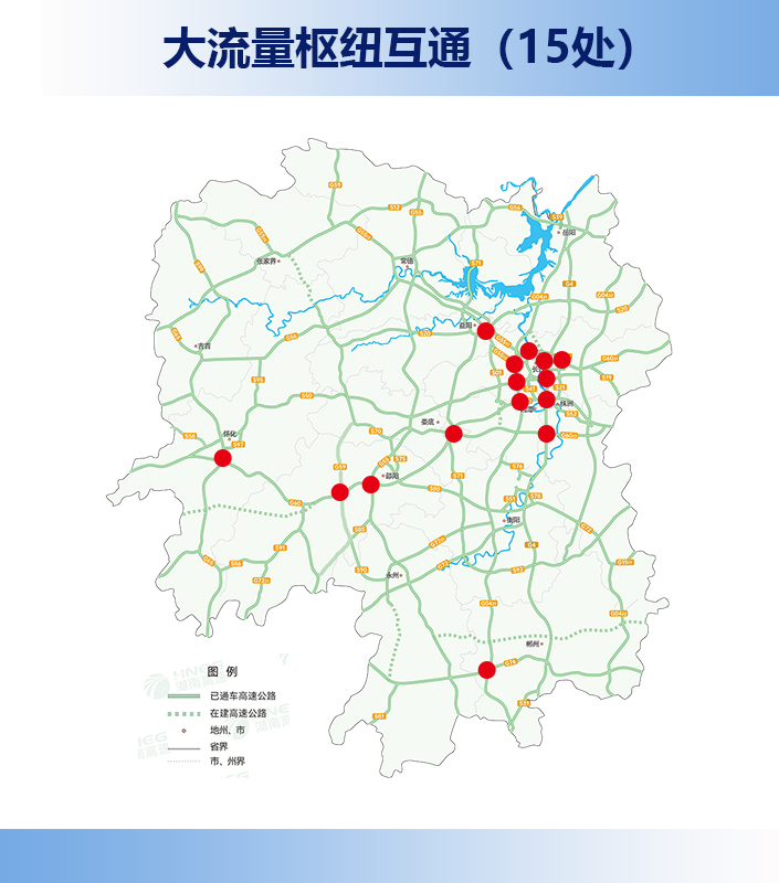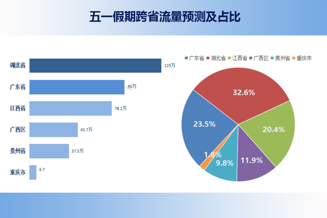 湘鄂界:预测湘鄂跨省车流量125万辆,占比32.6%,车流主要集中在京港澳、二广、许广高速。