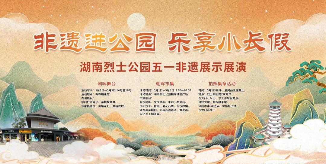 4月28日,记者从湖南烈士公园管理处获悉,“非遗进公园·乐享小长假”2026年五一朝晖市集活动将于5月1日至5日精彩亮相,以朝晖楼广场与朝晖楼茶馆为核心,打造集非遗展销、国风演艺、商户联动、沉浸体验于一体的假日文化盛宴,让湖湘非遗走进市井烟火,让市民游客在绿意盎然中触摸文脉、乐享假期。