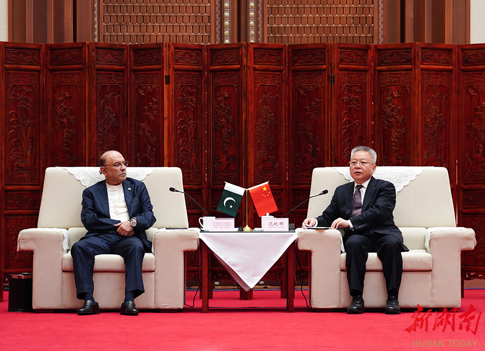 沈晓明代表省委、省政府和全省人民对扎尔达里一行来访表示欢迎,并简要介绍了湖南省情。他说,中巴两国“铁杆”友谊坚如磐石。今年是中巴建交75周年,湖南将认真落实习近平主席同巴方领导人达成的重要共识,深化与巴基斯坦在经贸、科技、教育、医疗等领域的务实合作,积极融入共建中巴经济走廊,为加快构建新时代更加紧密的中巴命运共同体作出贡献。