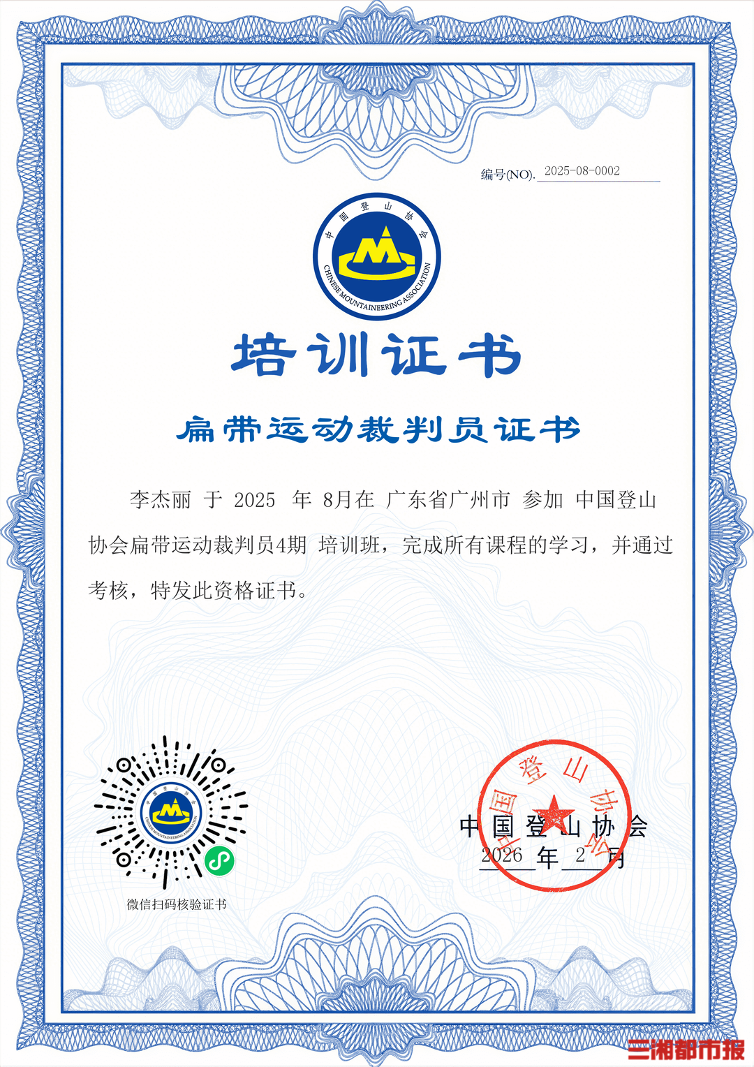 “目前正在全力备战2027年全国扁带大赛。”4月28日,湖南长沙,湖南财政经济学院大四学生李杰丽收到心心念念的扁带运动裁判员证书。自幼热爱体育运动的她,在“冷门”的休闲体育专业中选择了高空扁带行走,历经无数次摔倒与刻苦训练,突破重重考验,不仅实现了个人成长,更立志将此作为终身职业。