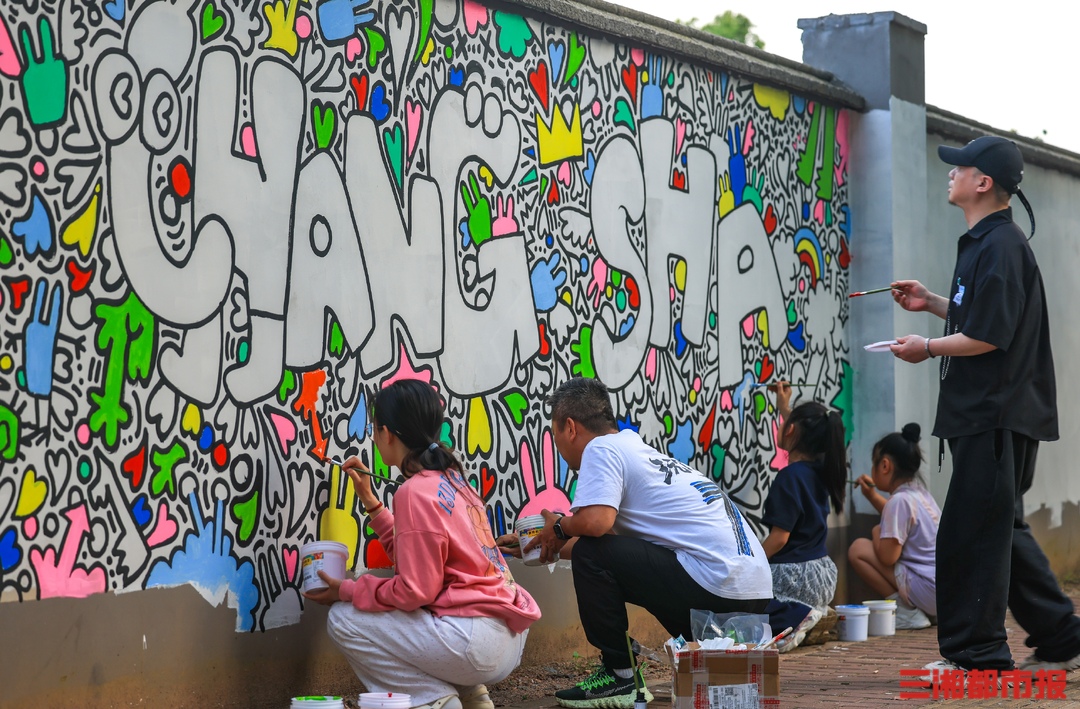 黑白的图形渐渐被色彩填满,原本斑驳的墙面变成了一幅逸趣横生的涂鸦作品。路过的行人放慢脚步,有人拿出手机拍下这抹街头亮色,有人笑着和画里的“CHANGSHA”合影。连路过的老人也会停下来笑着念叨,“这墙画得真热闹,看着就开心。”