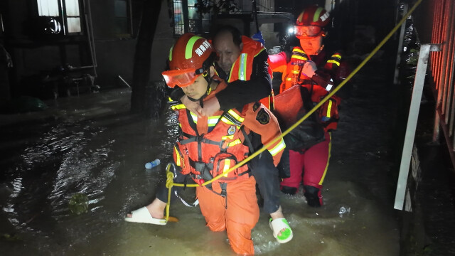 “老人家,别怕,我背您出去。”一名消防员俯身蹲下,稳稳地将老人背起,小心避开积水中的杂物;另一名队员撑起雨伞,全程护在老人身旁,一步步蹚过积水,将老人转移到安全地带。