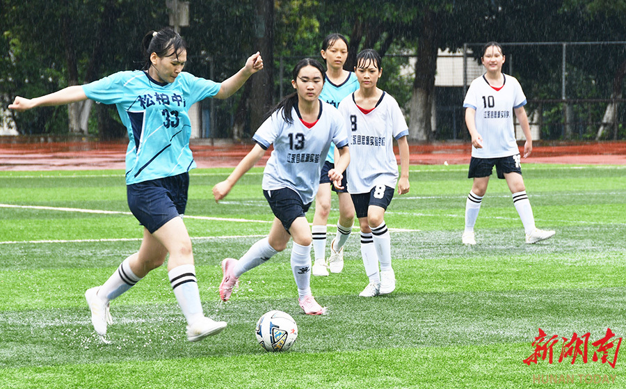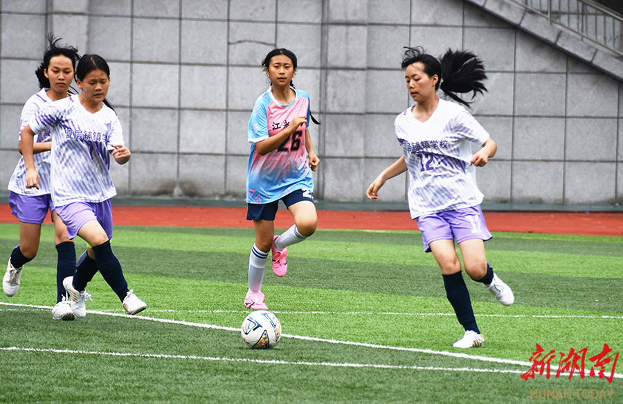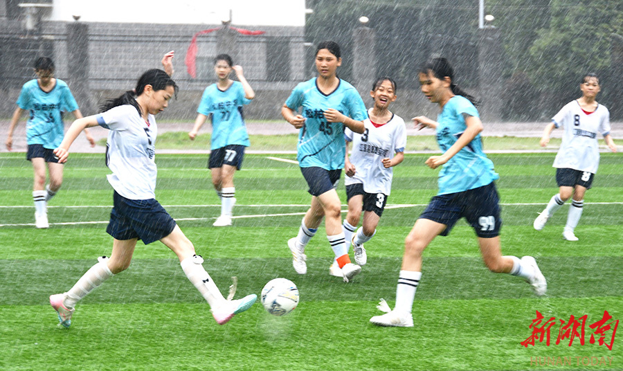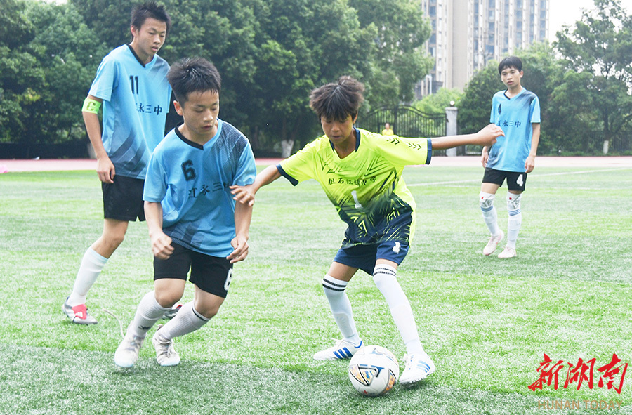 4月28日,江永县第一中学,学生在球场上展开激烈拼抢。当天,该县举行中小学生足球赛,35个学校代表队的600多名球员参加为期三天的角逐,共享足球运动的快乐,尽情释放青春的活力与激情。田如瑞 摄(湖南图片库)