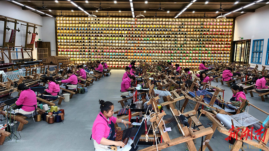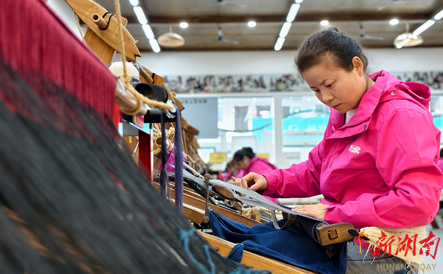 4月28日,2026年庆祝五一国际劳动节暨全国五一劳动奖表彰大会在北京人民大会堂举行,张家界乖幺妹土家织锦开发有限公司乖幺妹武陵源基地生产部荣获“全国工人先锋号”称号。图为女工在加工生产土家族织锦产品。吴勇兵 摄(湖南图片库)