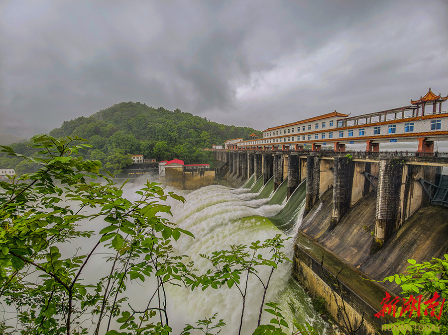 4月28日上午11时,为应对持续强降雨,湖南省水府庙水库启动防洪调度,开启五孔闸门,以900立方米/秒流量泄洪。当天11时,水库坝前水位为93.1米,略超汛限水位。水库管理部门正24小时密切监测雨水情变化,科学调控库容,确保水库及下游防洪安全。李海英 摄(湖南图片库)