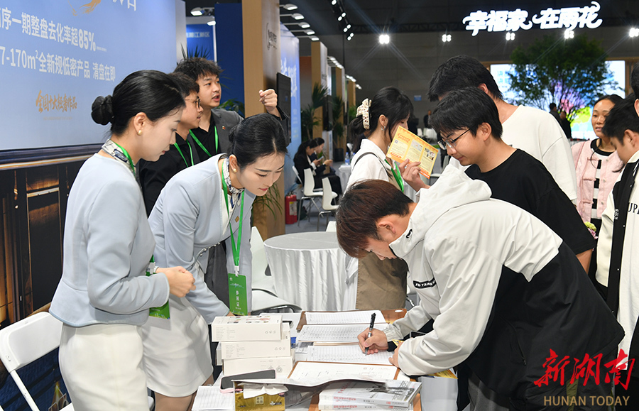 4月28日,2026年长株潭都市圈“好房子”交易推介会暨“湘聚一座城·幸福一家人”一站式置业活动在长沙国际会展中心开幕。活动由长株潭三市联合主办,为期8天,集中展示长株潭都市圈“好房子”建设成果。现场设1.35万平方米展区、近百个展位,吸引超过200家企业参展,为购房者提供多元化置业选择。图为市民在了解楼盘信息。 湖南日报全媒体记者 田超 王文 摄影报道