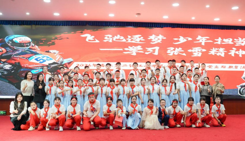 “心中有热爱,脚下有力量,追梦不止步”。活动现场,主持人饱含深情地讲述榜样张雪的励志故事:从乡间泥泞小路起步,他怀揣炽热的机车梦想,坚守初心二十余载,不惧风雨、不畏险阻,以日复一日的坚守、百折不挠的拼搏、精益求精的追求,一路披荆斩棘,带领中国机车站上世界顶级赛场,用实力为国争光,成为当之无愧的时代追光者。一段段动人的经历、一个个拼搏的瞬间,生动诠释了热爱可抵岁月漫长、坚持终能绽放光芒的深刻内涵,点燃了全体少年的追梦热情。