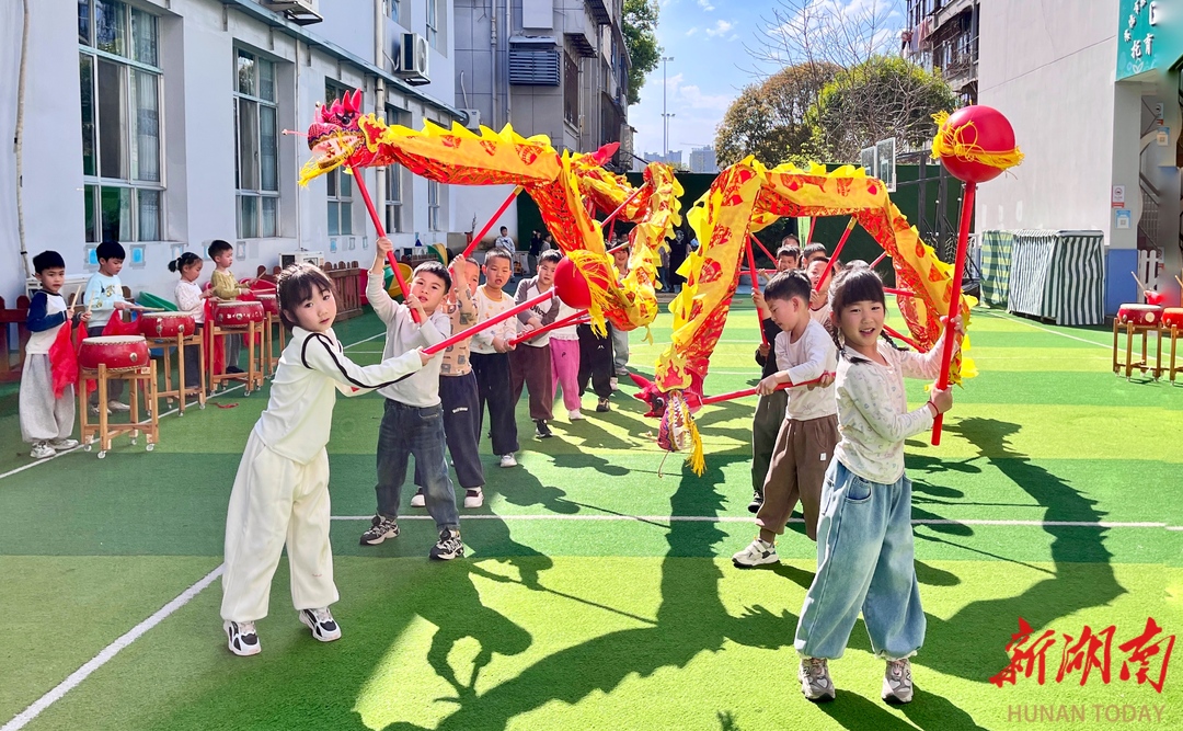 常德市鼎城区实验幼儿园的操场上,400余名幼儿手持五彩的九子鞭,跟着节奏起势、转身、甩动。鞭声如银铃清脆作响,和着改编自常德童谣《马马嘟嘟骑》的旋律,连泥巴园的紫藤萝都跟着晃悠。这是幼儿园里再寻常不过的一幕,也是孩子们用传统游戏书写的“活力序曲”。