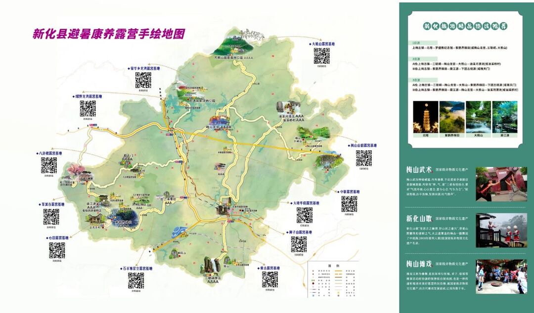 路线总序:县城(上梅古城)→ 三联峒(4A)→ 芭蕉山(3A)→ 紫鹊界(4A)→ 渠江源(3A)→ 奉家古桃花源→ 雅天门(3A)→ 龙湾湿地→ 云上溪(3A)→ 大熊山(4A)→ 梅山龙宫(4A)→ 楚怡工业学校旧址(3A)→ 油溪桥(3A)→ 车田江(3A)→ 县城(上梅古城)