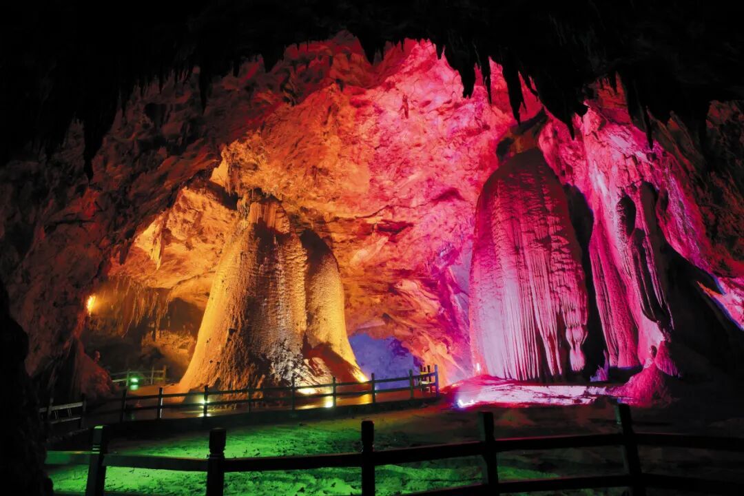 【梅山龙宫】——洞内景观丰富多彩,绝世景观举不胜举,水路神秘莫测,可乘船荡舟;旱路曲径通幽,沿途流石景观姿态各异美不胜收;石笋、石钟乳玲珑剔透、栩栩如生,被专家称为“亚洲最美丽的地质博物园”。